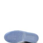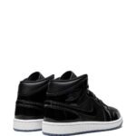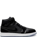 The Air Jordan 1 Mid SE “Space Jam” sneakers feature a sleek and bold design. This model features black patent leather through much of its construction, with smooth leather underneath it, and sits atop a white rubber sole and an icy blue outsole. The iconic Jumpman logo appears stamped onto the tongue.