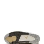 The Air Jordan 4 “Photon Dust” sneakers come in a light-grey hue. They’re crafted from calf leather and are enhanced with a beige Jumpman logo that matches the eyelets.