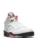 The Air Jordan 5 “Fire Red – Silver Tongue” is a Spring 2020 release of the original colorway of Michael Jordan’s fifth signature shoe. This version brings back the classic “Nike Air” branding previously found on original 1990 releases of the model, that had since been replaced with a Jumpman logo on previous retros. Jordan Brand brings back many original styling elements of the shoe including a reflective silver tongue, black midsole with shark tooth detailing, and an icy translucent blue outsole. Premium white leather covers the upper, save for the clear mesh panel on the midfoot. Red Jumpman branding appears on the tongue and a true-to-original translucent lace lock assists in tying the laces together, just like it did back when Jordan famously wore the sneaker in the ‘90s.